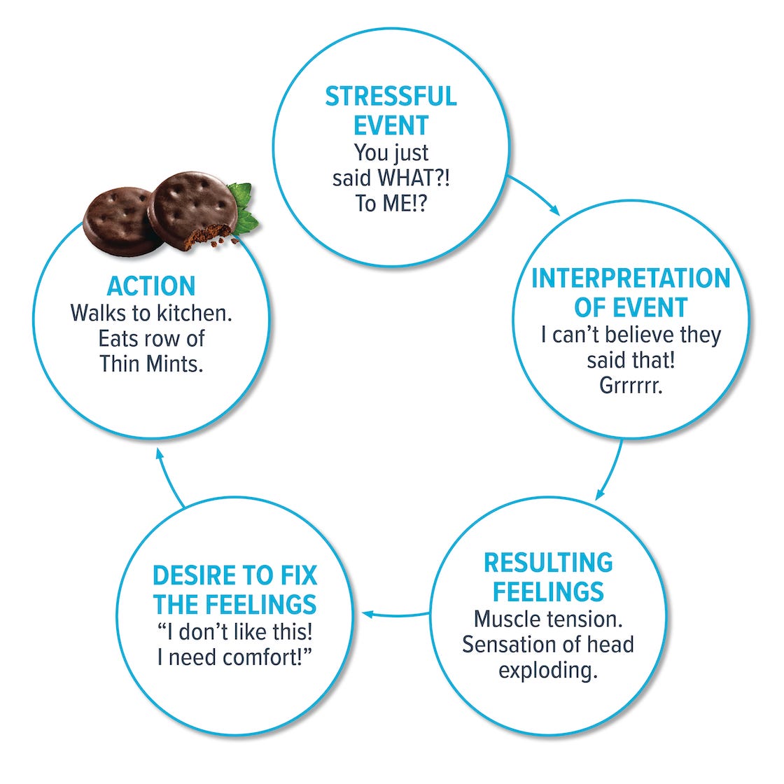 In reality, the path from “stress” to “eating food” has several individual steps, as the graphic below shows.